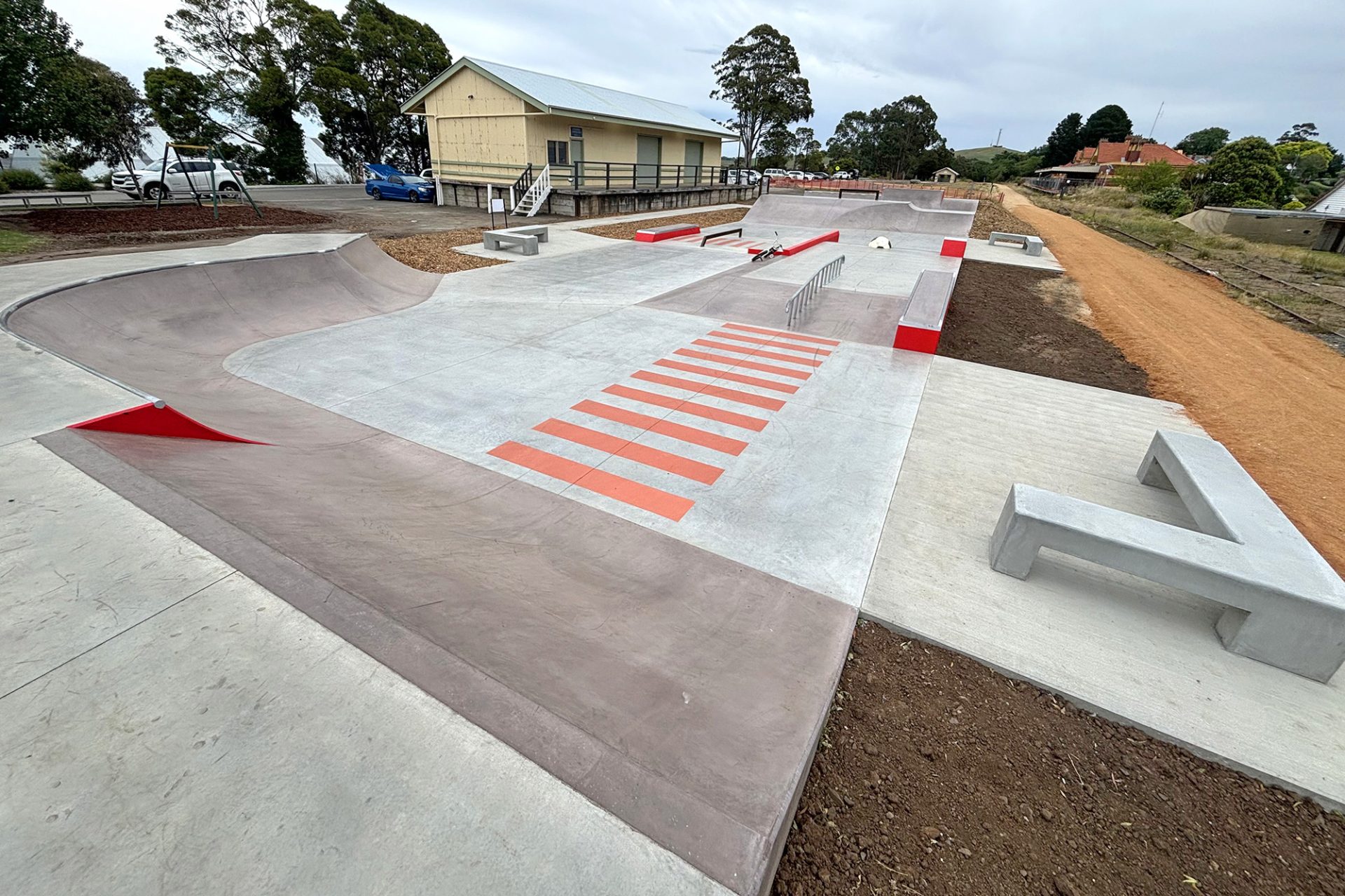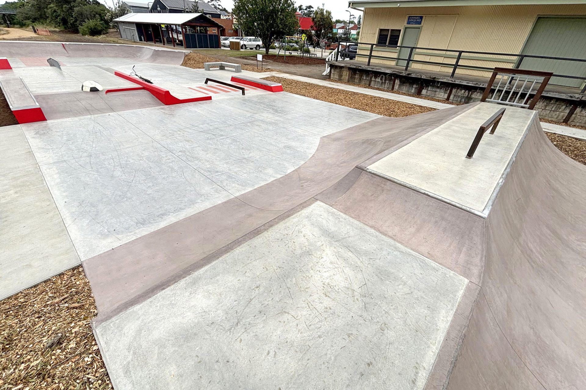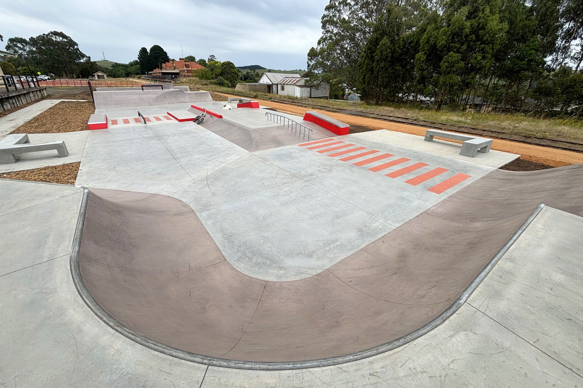 The Korumburra Skatepark replaces the well used but very tired steel ramps that were over 20 years old. Also updated was the location with the new skatepark now being shifted to the center of the Korumburra community. This location alongside the heritage train station and rail yards offered much better CPTED principles, connections to the rail trail and ability to tie into the sites historical aesthetics.