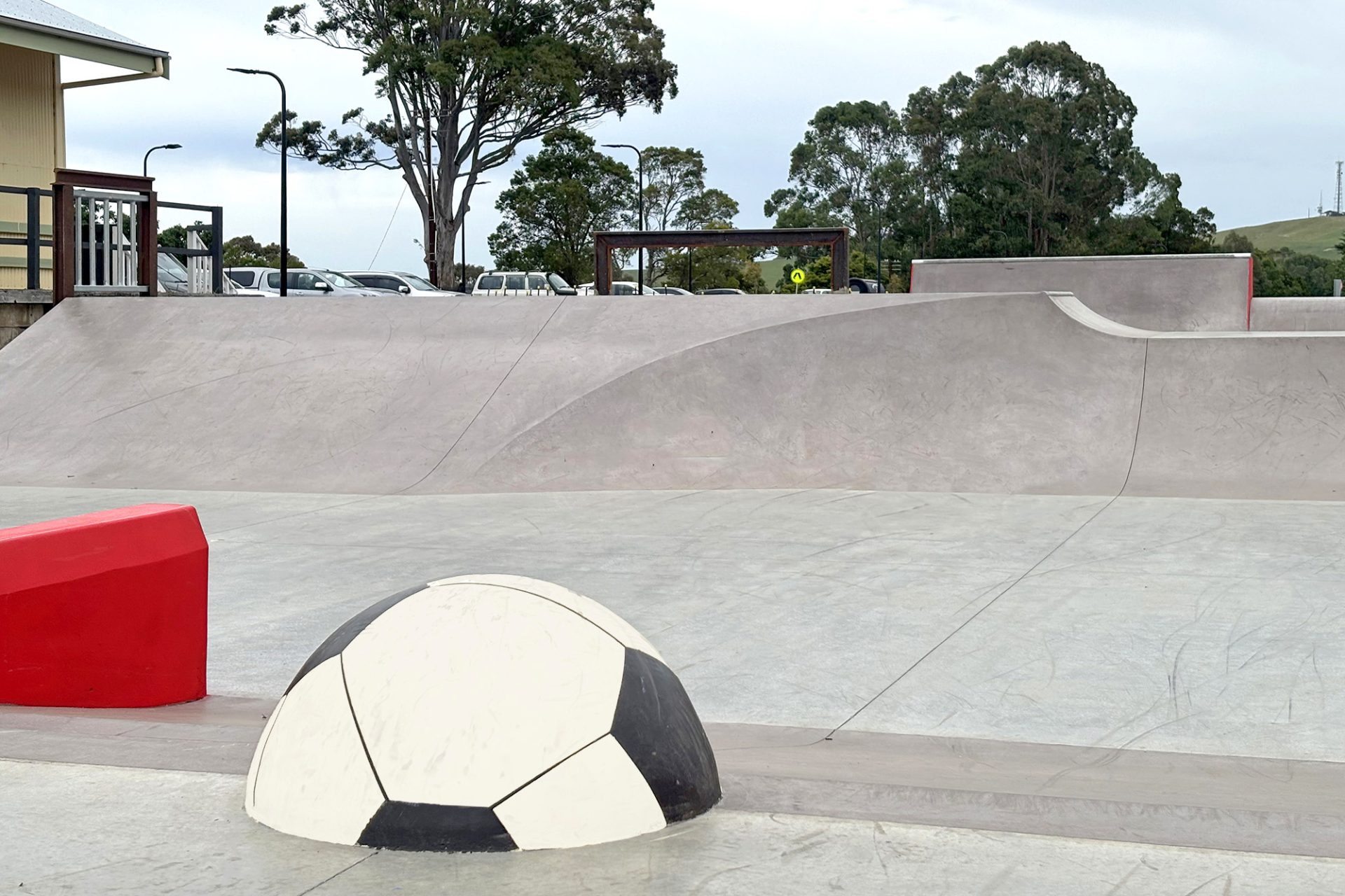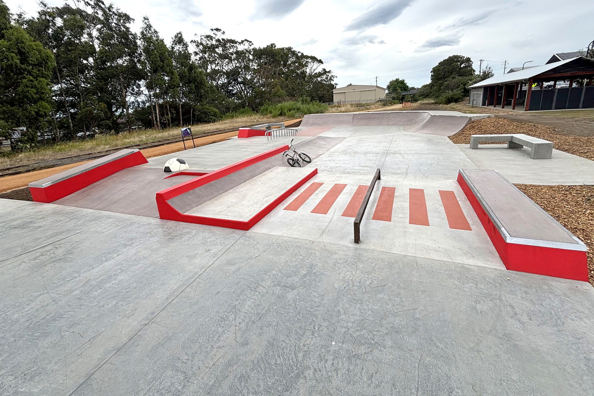 The railway connection is featured in the park where original railway tracks are utilised for a flat rail and sub-rail. Accompanying the funbox is our trademark local acknowledgement which in this instance a rideable soccer ball represents the sport being introduced into the community by the immigrants employed for the coal mining industry during the 19th century.